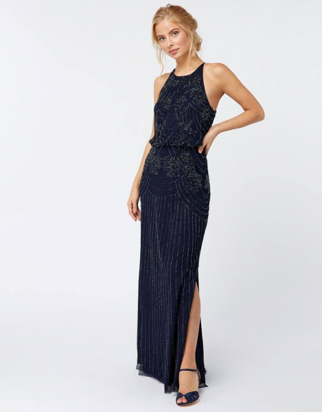 A gorgeously designed Channel Art Deco maxi dress that oozes opulence for your bridesmaid. This ankle-length Blake dress with a sheer fabric top layer boasts shining embellishments all over sewn in a floral pattern. The gown has a vintage look, is fully lined and available in pink, navy and light blue.